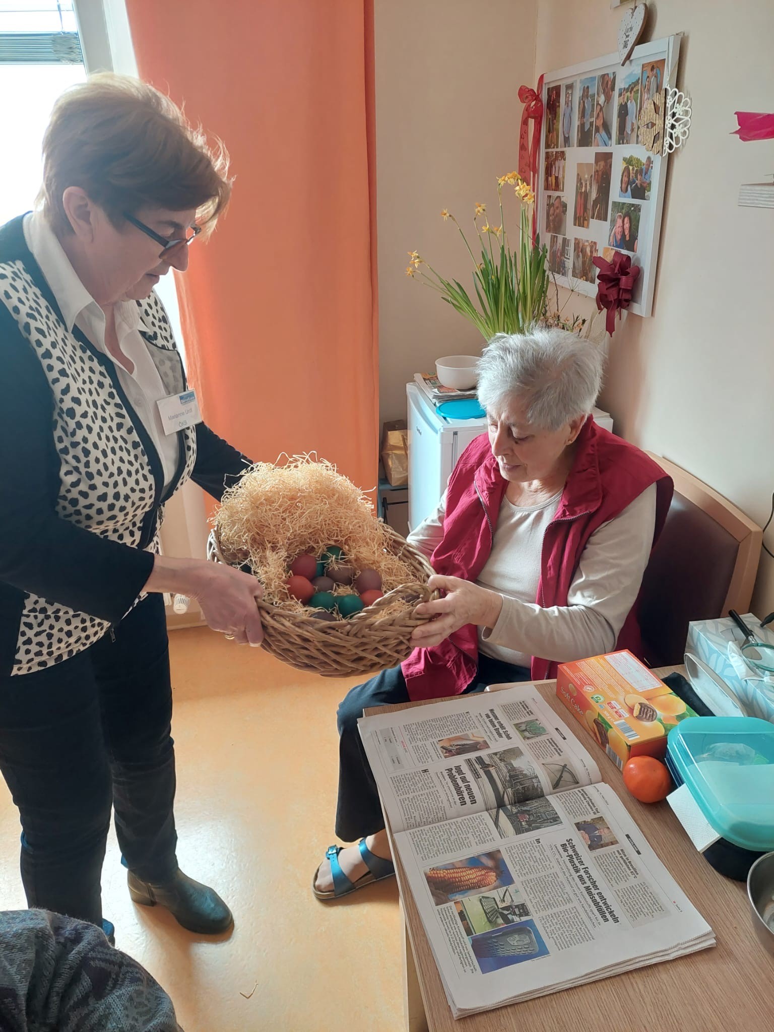 Auch dieses Jahr wurde das SeneCura Sozialzentrum Wildon von der Frauenreferentin Helene Peier und Marianne Urdl vom ÖKB in Wildon mit bunten Ostereiern für die Bewohner:innen und Mitarbeiter:innen überrascht. Natürlich handelte es sich um Freilandeier, welche von den Damen selbst gefärbt wurden. Ausgestattet mit einem großen Korb voller bunter Ostereier durfte sich jede:r Bewohner:in ein Ei seiner Wahl nehmen. Gerne auch zwei, sodass die Herrschaften für das fröhliche Ostereierpecken gerüstet sind.