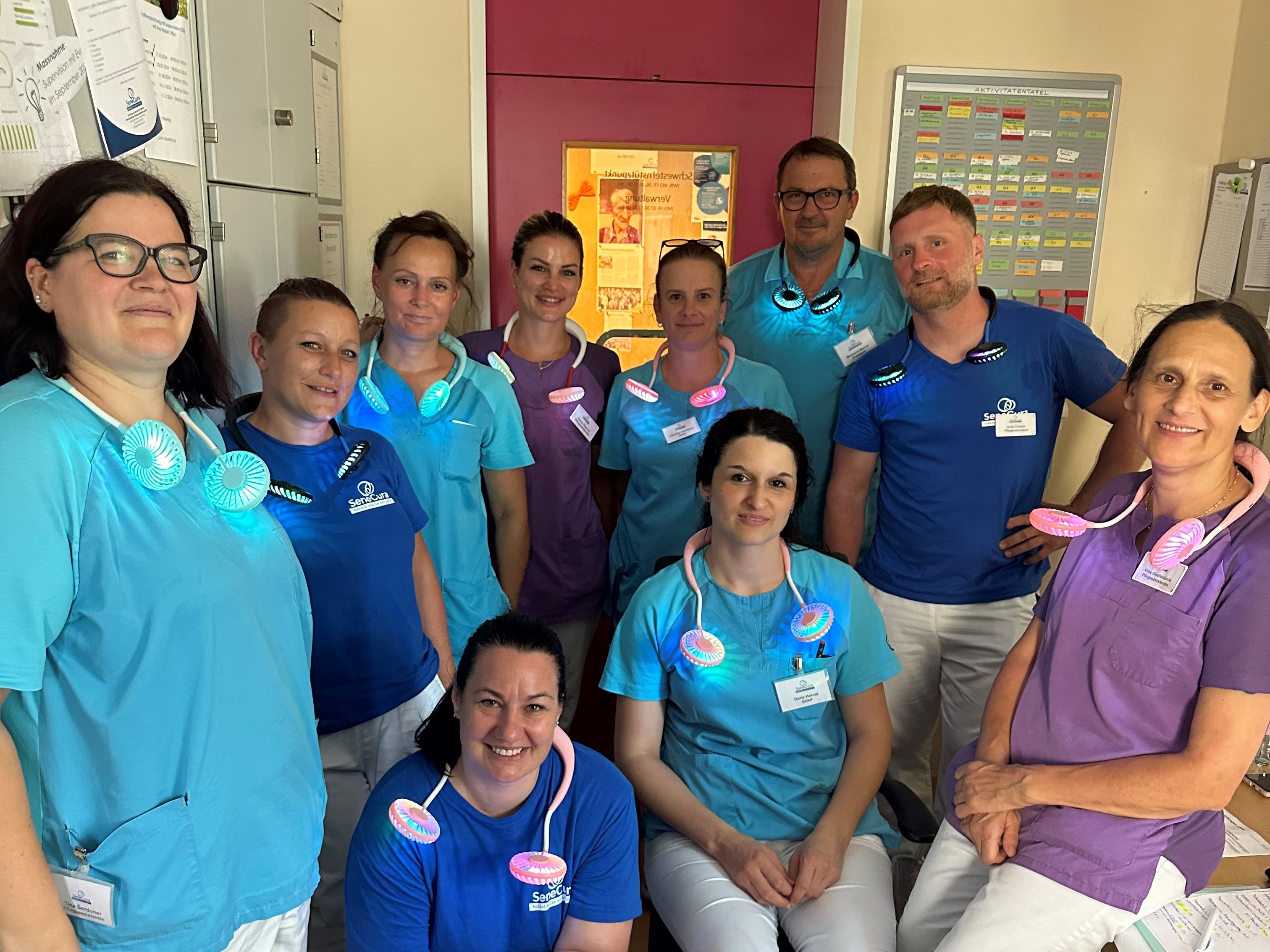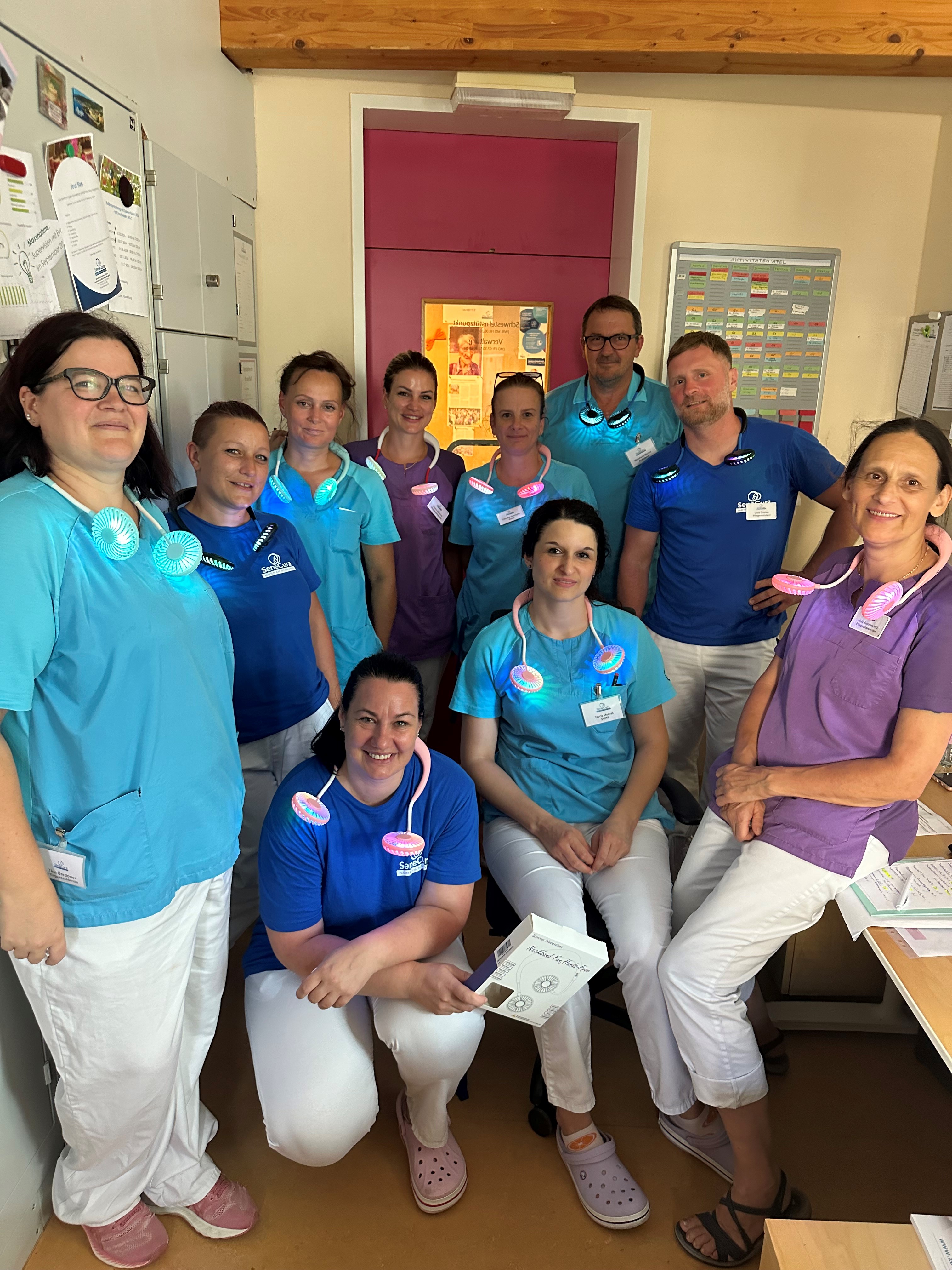 Sommer heißt leider nicht nur am Strand liegen und Wärme genießen, sondern auch bei weit über 30 Grad zu arbeiten. Das SeneCura Sozialzentrum Wildon unterstützt die Mitarbeiter:innen mit regelmäßigen Eislieferungen, kalten Getränken und jetzt neu mit Ventilatoren für das Gesicht. Sie sind bei diesen Temperaturen zwar kein Allheilmittel, aber eine kleine Abkühlung an den richtig heißen Tagen.