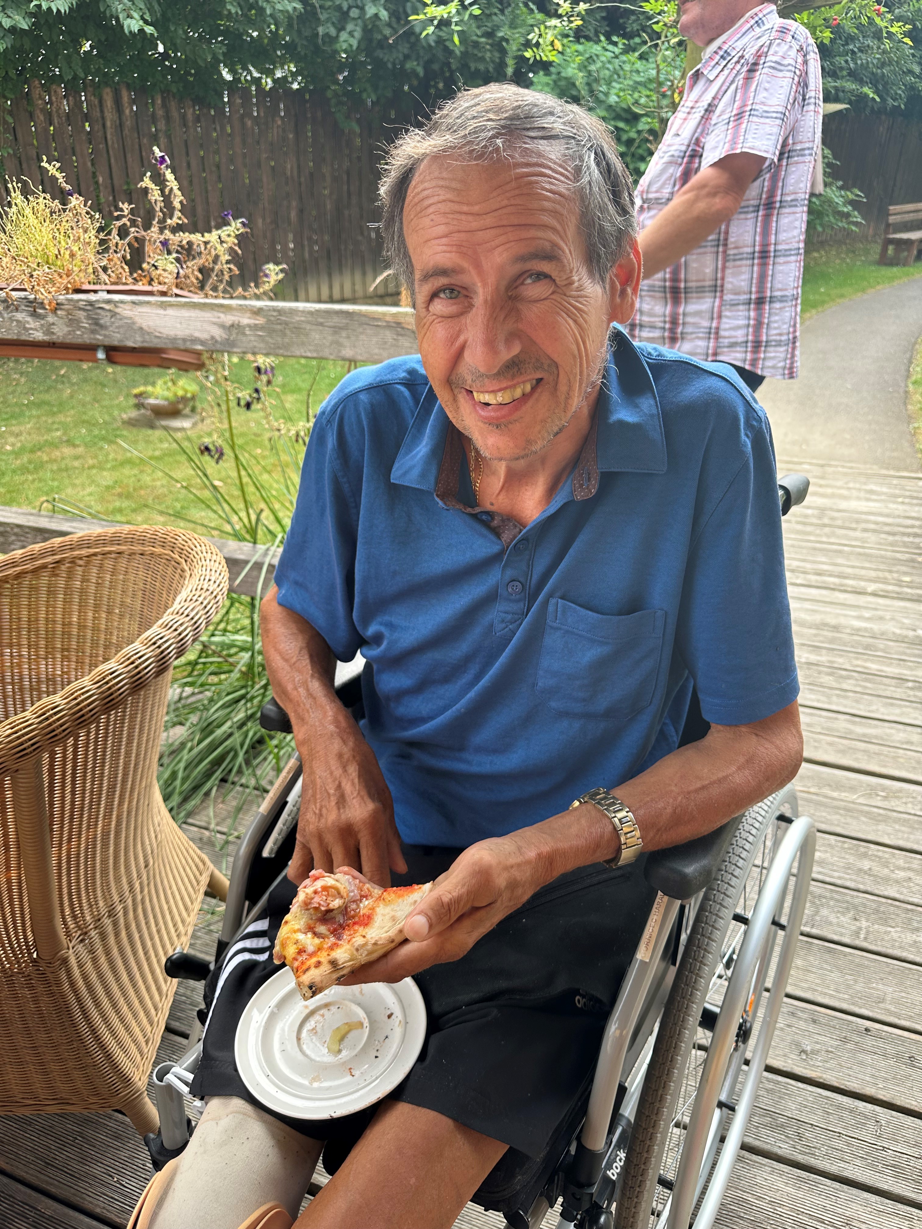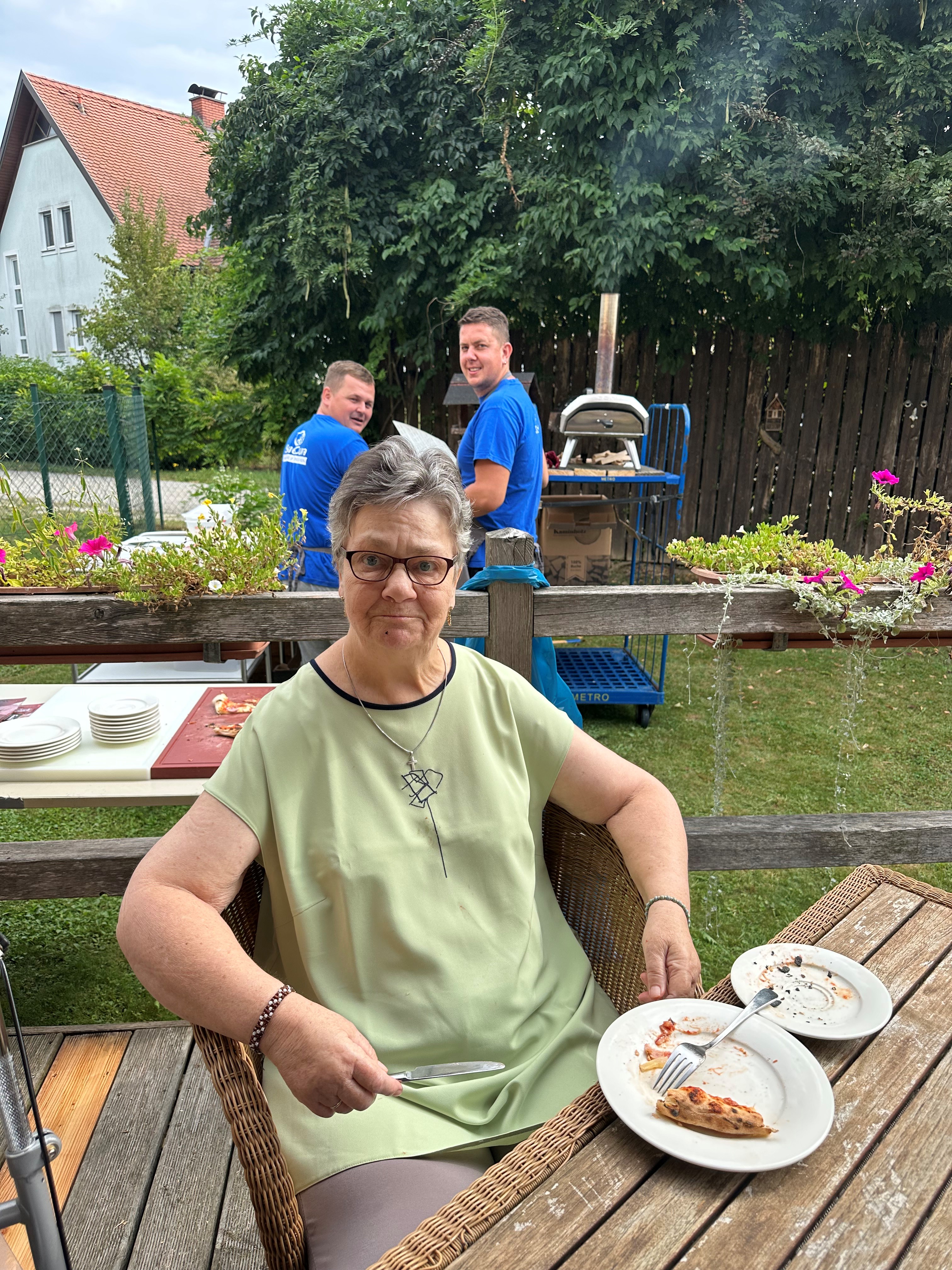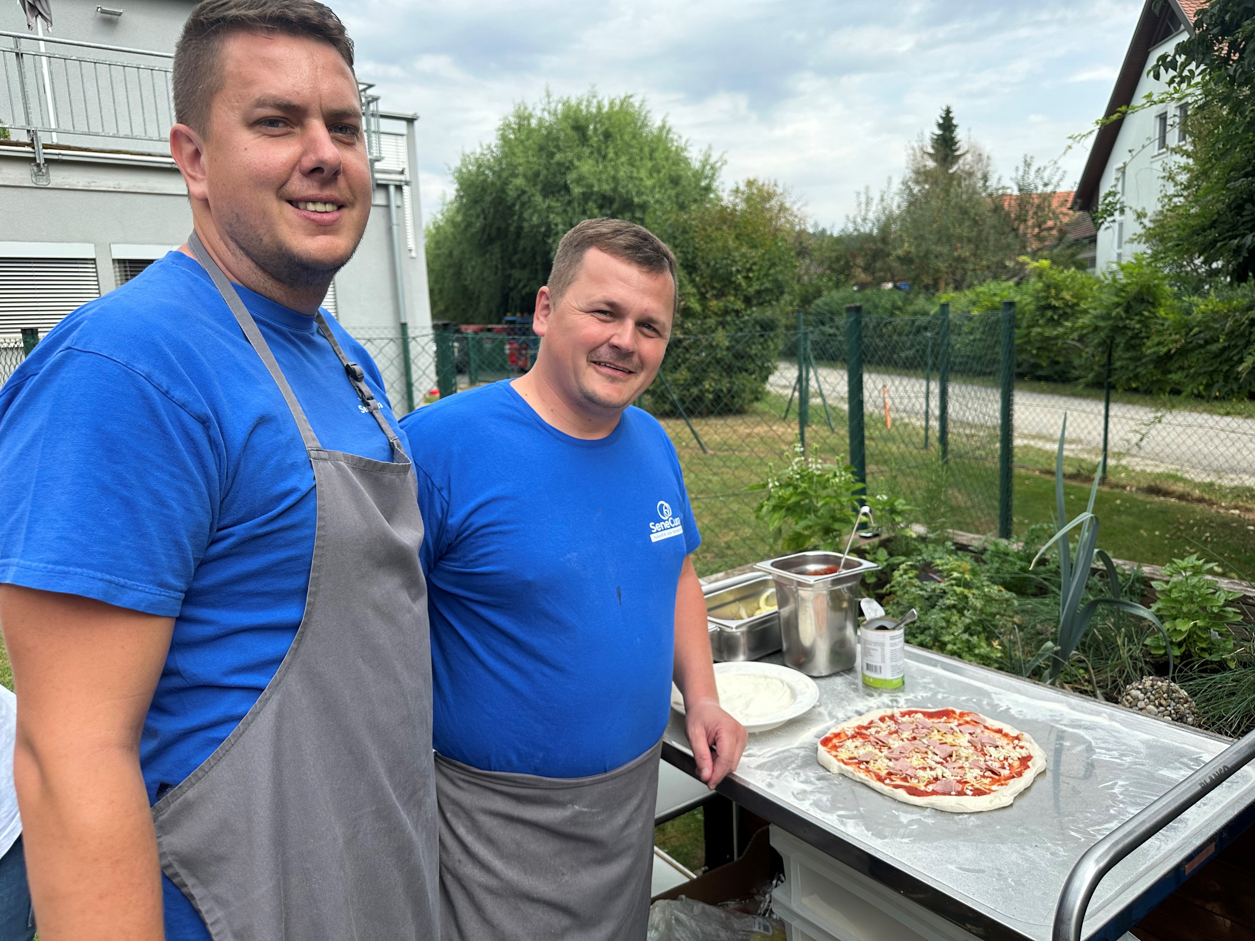 Die Pflegeassistenten des SeneCura Sozialzentrums Wildon, Budja Luka und Zizek Boris, sind begnadete Pizzabäcker und lieben es, für die Bewohner:innen des Hauses knusprige Pizzen im dafür eigens mitgebrachten Pizzaofen zuzubereiten. Das ist immer ein besonderes Highlight und sie kommen fast gar nicht nach, die vielen verschiedenen Pizzawünsche der Seniorinnen und Senioren zu erfüllen. Jede:r Bewohner:in kann sich seine Lieblingspizza nach Maß zubereiten lassen. Genossen werden diese Leckerbissen auf der schönen hauseigenen Terrasse.