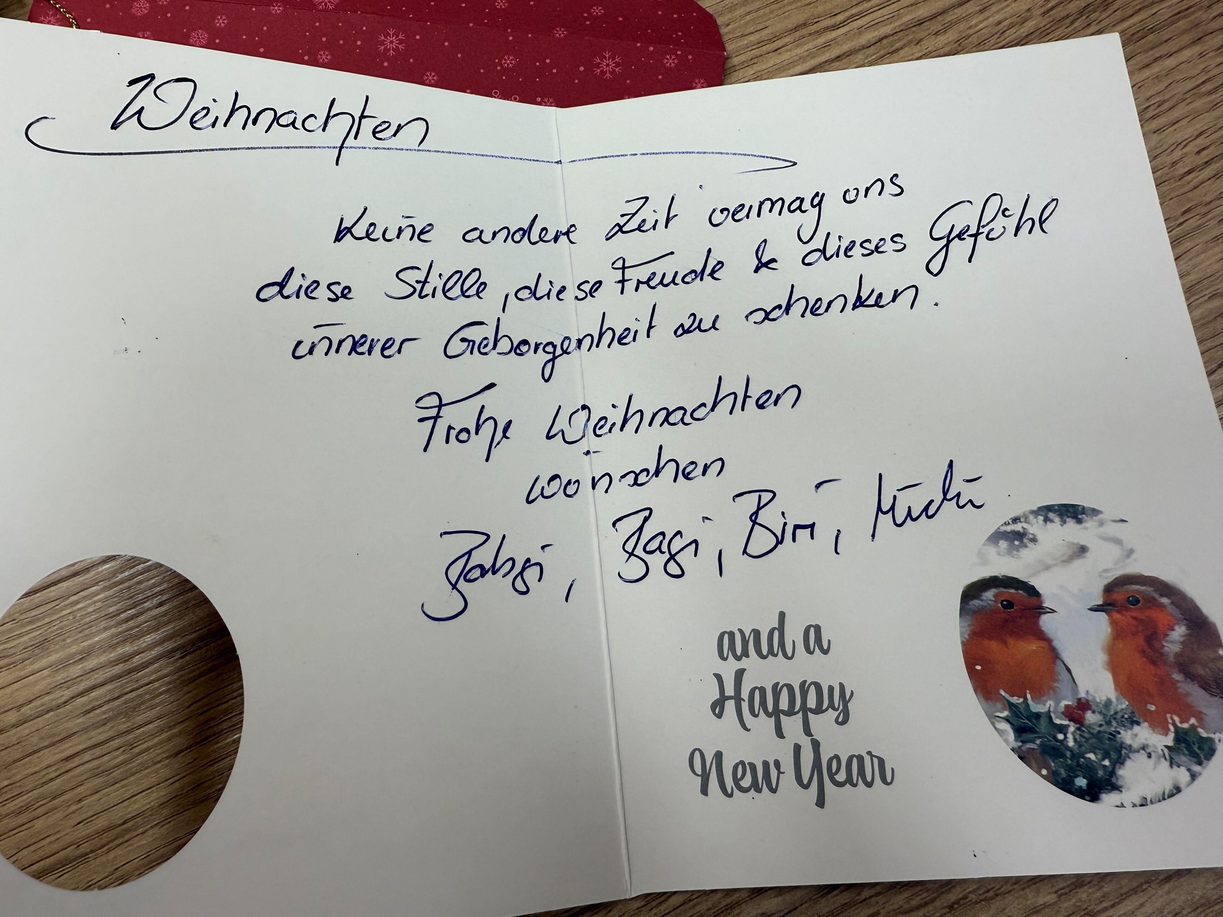 Jedes Jahr zu Weihnachten passieren schöne Dinge im SeneCura Sozialzentrum Wildon, die unser Herz erwärmen. Gerade eben kam eine Dame zu uns herein und übergab einer Mitarbeiterin einen große Tasche mit dekorierten Kuverts mit handschriftlichen Weihnachtswünschen für unsere Bewohner:innen und Mitarbeiter:innen. Wer das war? Tja, das wissen wir leider nicht so genau. Die Dame meinte nur, dass es sich um eine liebevolle Geste aus der Nachbarschaft handelt. Meine Spürsinn sagt mir, dass kann nur das Christkind gewesen sein. Wir möchten uns herzlich bei Babsi, Basi, Bim und Michi für diese wundervolle Überraschung bedanken. Wir haben uns sehr gefreut.